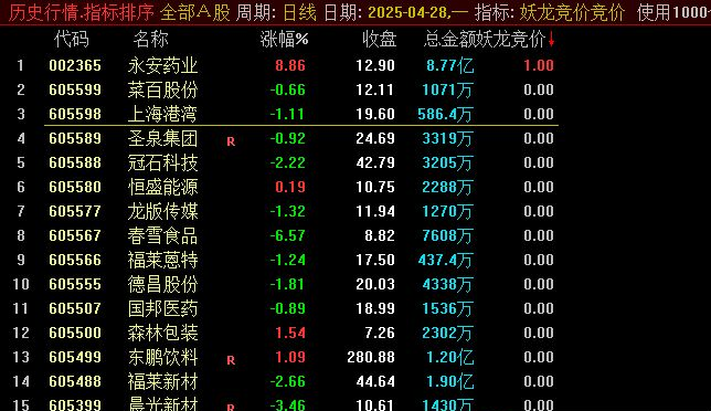 优先选取“妖龙竞价”排名首位的个股,若头名个股出现一字涨停或涨幅超8%等情况,则依次向后筛选,原则上3名之后标的建议放弃(实测前三名胜率显著优于后续标的)。